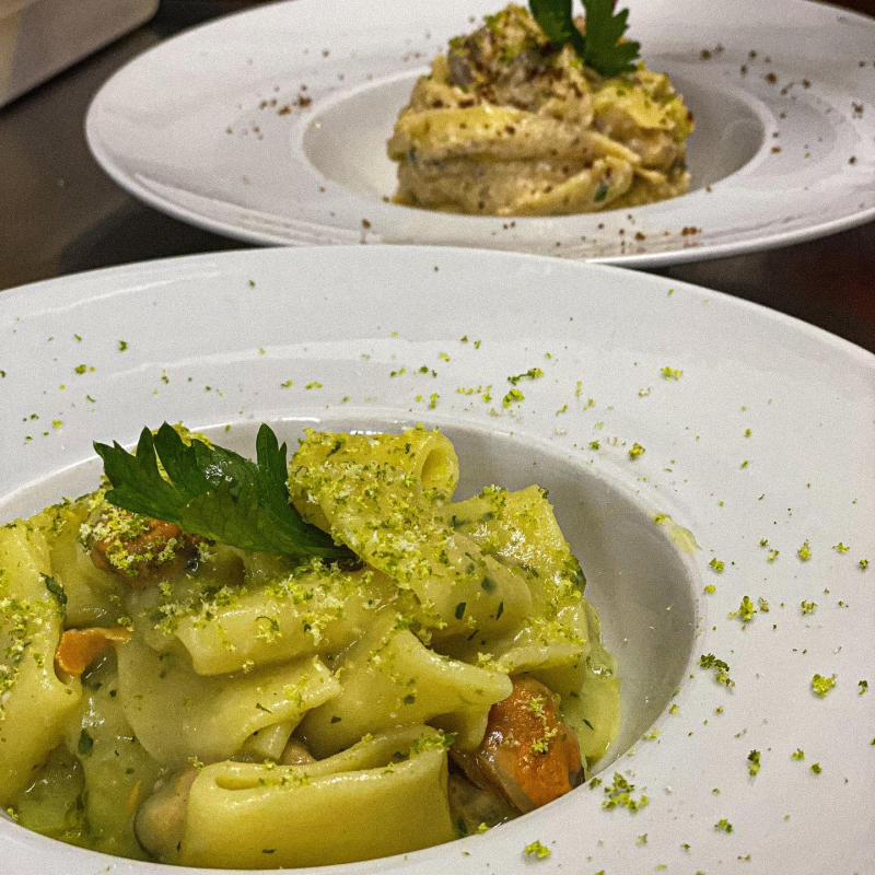 Il menù, che varia in base alle stagioni a garanzia della freschezza e qualità delle materie prime, comprende prelibati primi piatti. Ampia la scelta tra tagliatelle alla carbonata di mare con bottarga di muggine e lime, calamarata su vellutata di patate e cozze, tortoni al tartufo, ovvero tortelli ripieni di carne di manzo Made in Caluae, mantecati con tartufo e scaglie di tartufo fresco, strascichi con peperoni cruschi, menta e caciocavallo e non possono mancare i funghi porcini.